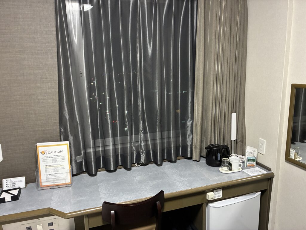 客室は新しく清潔感があり、デスクも広々としているので仕事や作業がしやすいのが嬉しいポイント。フロントではペットボトルのお水がもらえたり、加湿空気清浄機もきれいに整備されていたりと、細かな気配りが感じられます。